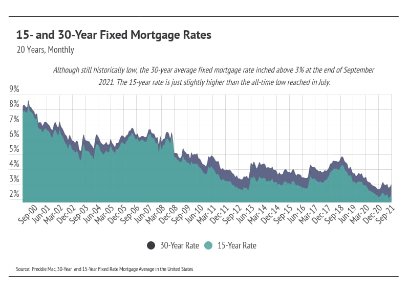 Home prices tend not to experience meteoric rises if the economy is in dire straits. Because home prices have increased so rapidly over the last two years, we can assume that the economy is doing well. In the last five years, housing inventory has decreased by around 940,000 (59%). Over 700,000 of those homes were sold in the last two years alone. Due to the pandemic, housing demand rose to historically high levels and mortgage rates fell to historic lows. As shown in the chart below, we’re currently hovering near all-time low mortgage rates, which will likely remain for the rest of the year. Low rates incentivize buying due to the lower monthly payment.