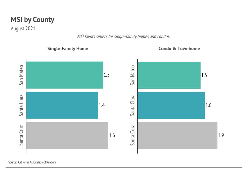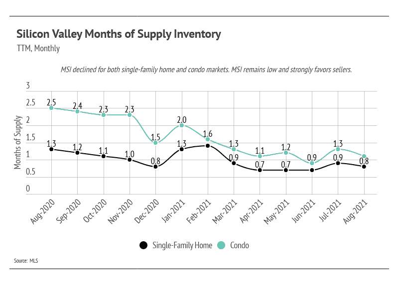 Both single-family homes and condos spent less time on the market in August 2021 than they did in August of last year. As we’ll see, the pace of sales has contributed to the low Months of Supply Inventory (MSI) over the past several months.
