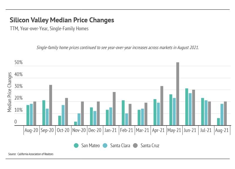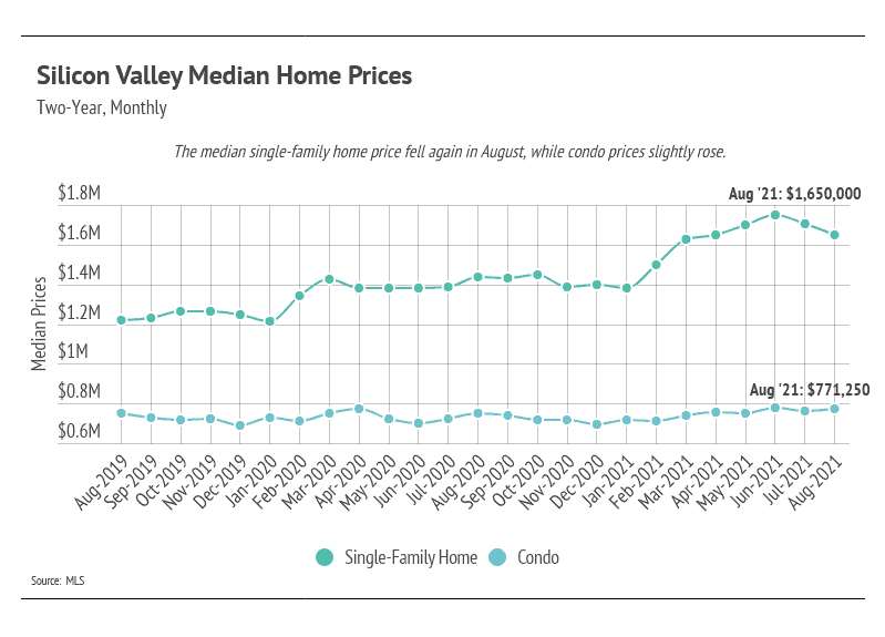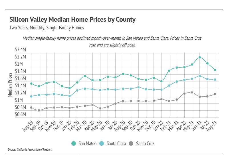 During August 2021, in Silicon Valley, the median single-family home price declined — mostly due to San Mateo County, although Santa Clara prices declined slightly as well. Santa Cruz home prices rose month-over-month, almost returning to an all-time high.
