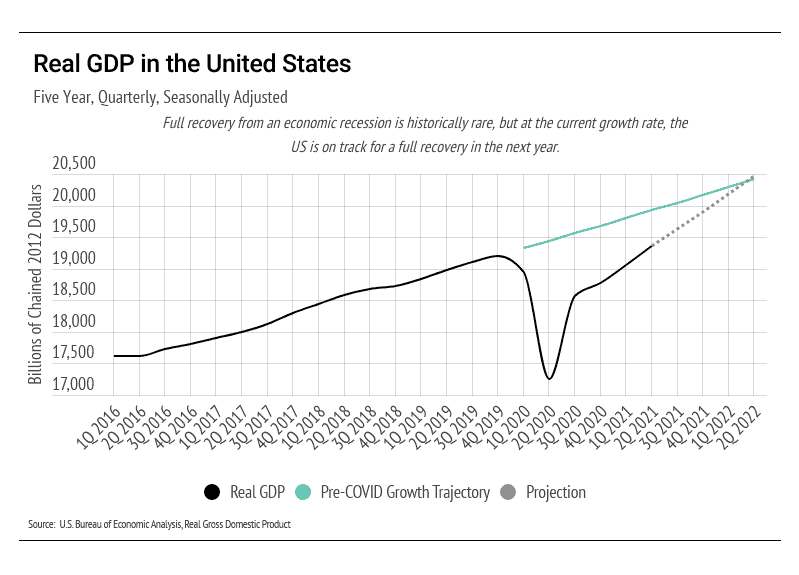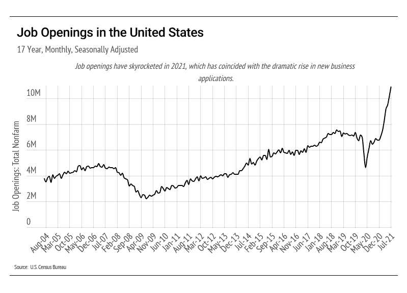 Despite the high rate of unemployment and record number of job openings, U.S. production is climbing rapidly. In terms of GDP, which is the broadest measure of goods and services produced, our economic recovery could reach where we would likely be if the pandemic had never happened within the next year. It cannot be overstated how rare it would be to return to pre-recession GDP, but we might just get there. A potential factor in the rise of both production and job openings is the resurgence of entrepreneurship, which is often associated with higher production.