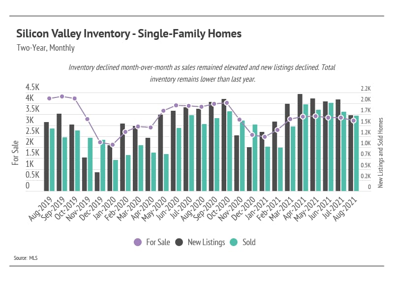 Single-family home inventory began to climb at the start of 2021 in anticipation of the spring season, when more sellers typically come to market, but has begun to decline once again. To gain a full picture of the current market, we must view it in the context of last year. In 2020, fewer people wanted to leave Silicon Valley, while more people wanted to move to the area. This trend drove inventory down to record low levels. New listings, therefore, improve the current market conditions. However, new listings aren’t keeping up with demand. In August 2021, Silicon Valley had 16% fewer homes for sale than it did in August 2020. Furthermore, when we compare the current inventory to August 2019 (pre-pandemic) levels, the number of homes for sale has declined by 24%. The sustained low inventory will likely cause prices to remain stable or appreciate throughout 2021.