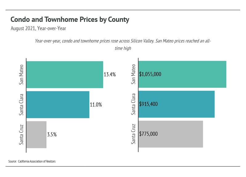 As you can see in the graph below, median condo prices increased in Silicon Valley. San Mateo condos and townhomes reached an all-time high, while Santa Clara and Santa Cruz are slightly below peak.