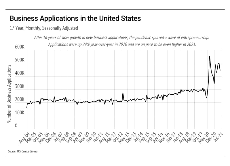 Another large government-sponsored infusion of cash into the economy is very unlikely to happen. We may, however, have another source of economic stimulus: the massive growth in entrepreneurship over the last 16 months. From 2004 to 2019, the United States averaged 2.8 million new business applications per year. In 2020, there were 4.36 million, and in 2021, there have been 3.68 million as of August. This means that over the past 20 months, the United States has seen 8 million new business applications.