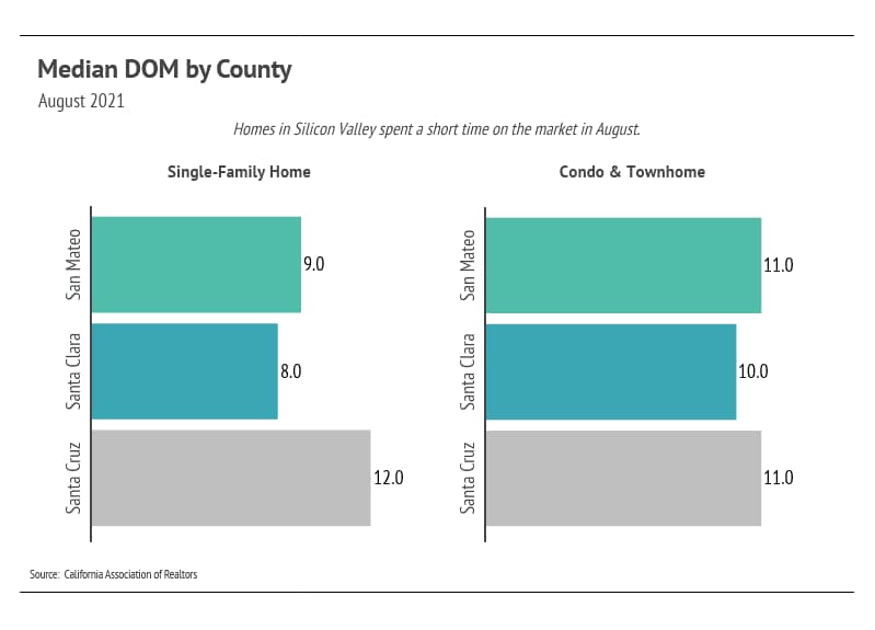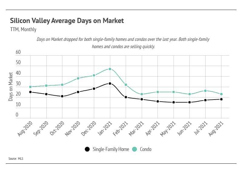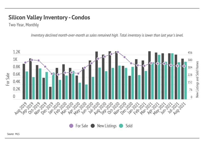 The number of condos on the market declined slightly in August 2021 but seems to have stabilized overall. Condo demand remains incredibly high in Silicon Valley, and new listings are selling quickly.
