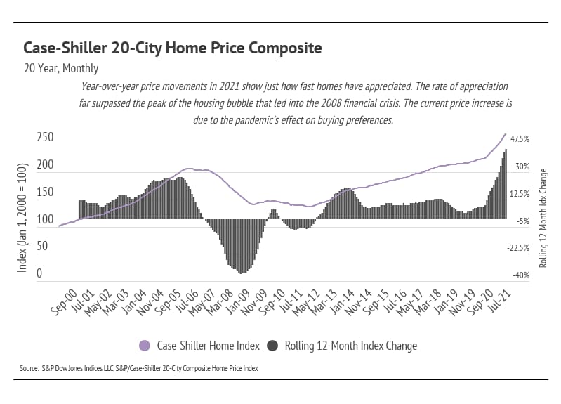 Home prices appreciated faster in 2021 than at any other time, even surpassing the 2004–2006 housing bubble.