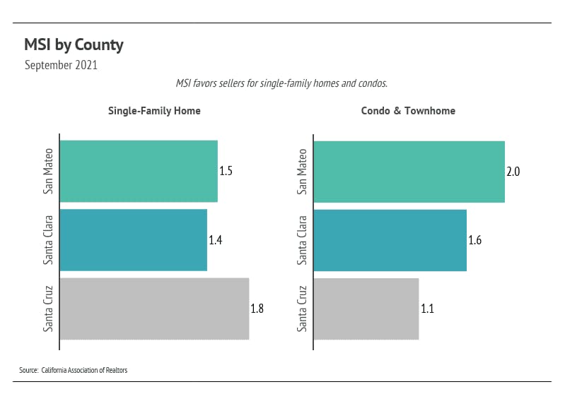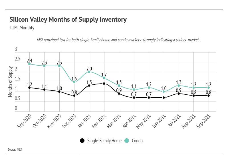 Months of Supply Inventory (MSI) quantifies the supply/demand relationship by measuring how many months it would take for all current homes for sale on the market to sell at the current rate of sales. The average MSI is three months in California, which indicates a balanced market. An MSI lower than three indicates that there are more buyers than sellers on the market (meaning it’s a sellers’ market), while a higher MSI indicates there are more sellers than buyers (meaning it’s a buyers’ market). MSIs in Silicon Valley are near all-time lows for single-family homes and condos, indicating a sellers’ market in all markets.