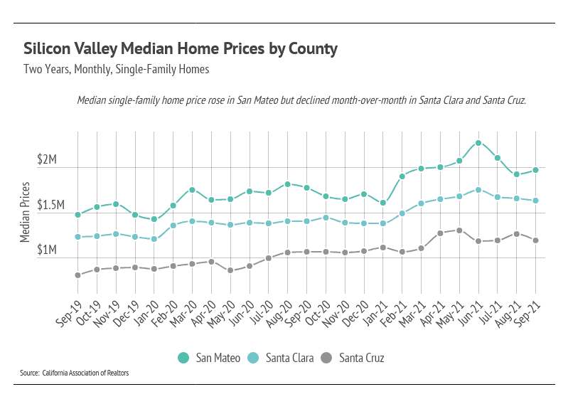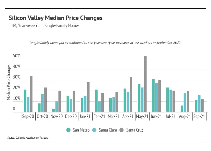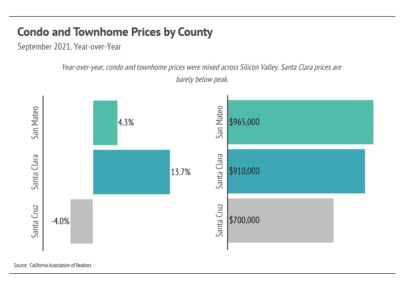 The growth rates in 2021 are highly unusual and unsustainable; for example, home prices would more than double every five years at a 15% growth rate. After huge single-family home price appreciation in the first half of the year, it made sense that prices declined in the third quarter. During the summer months (July–September), San Mateo County home prices declined 13%, up 16% for the year. During the same time period, Santa Clara home prices experienced a less substantial decline: a drop from 27% in June to 19% in September. Santa Cruz gained 1%, bringing the year-to-date price increase to 11%.