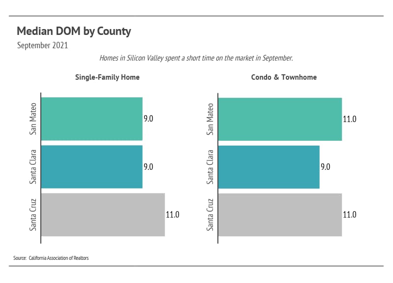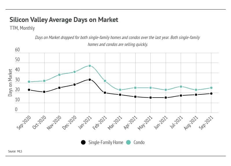Homes are selling faster than at any point in the last 15 years. The Days on Market reflects the high demand for homes in Silicon Valley. Buyers must put in competitive offers, which, on average, are 1–5% above the list price of the home.