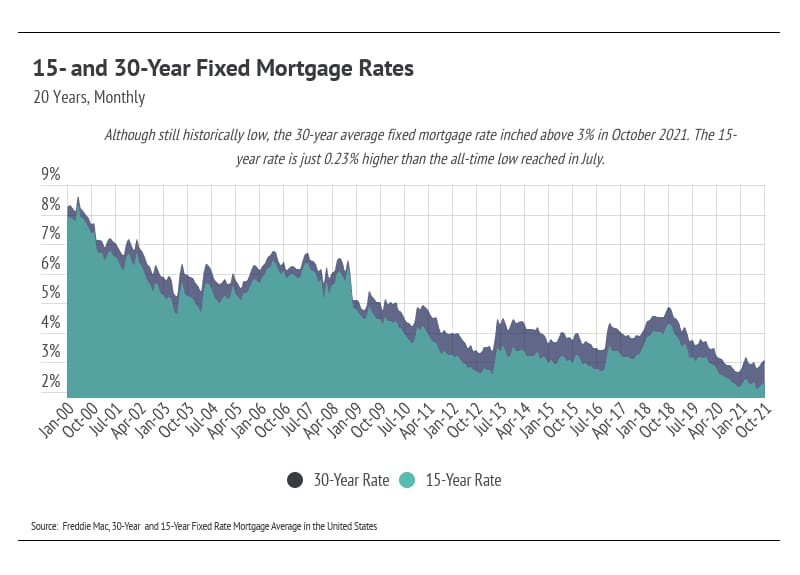The average 30-year fixed mortgage rate, while still historically low, rose to 3.14% at the end of October 2021.