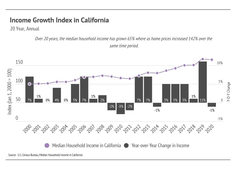 Home prices in the last 20 years increased at more than twice the rate of the median household income in California (142% vs. 65%).