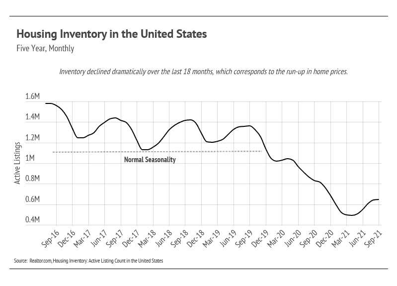 The pandemic also changed buyer preferences. Rather than spending roughly half of our time at home, which is the norm, we were faced with endless time in our living spaces. (You remember — you were there.) As of September 2021, the United States has 59% fewer homes on the market, and 53% of that happened in the last two years. We were happy to see more homes on the market in the second quarter of 2021 because the increased supply helped satiate the high buyer demand, but we are already seeing the seasonal shift to fewer homes coming to market. Inventory will likely remain super low in the coming fall and winter months.
