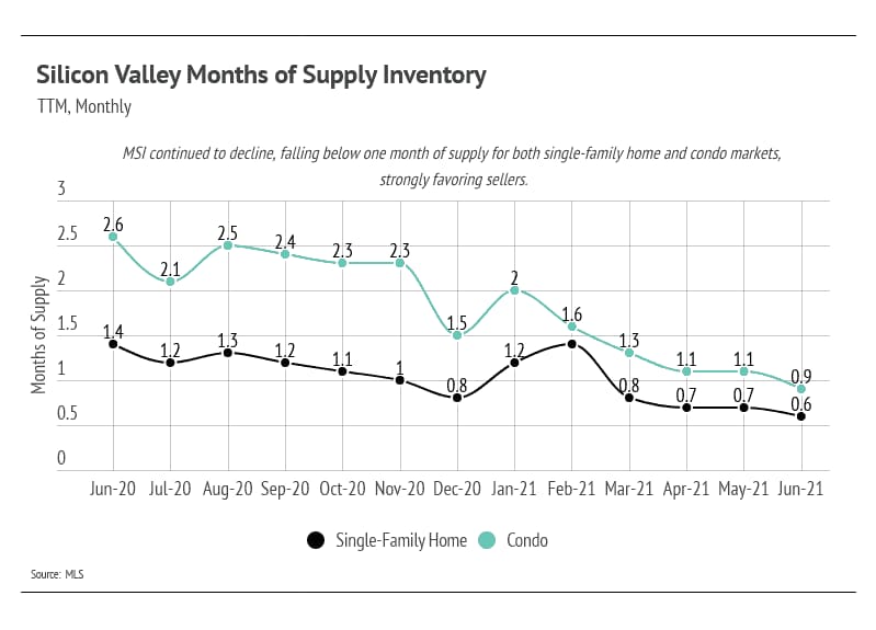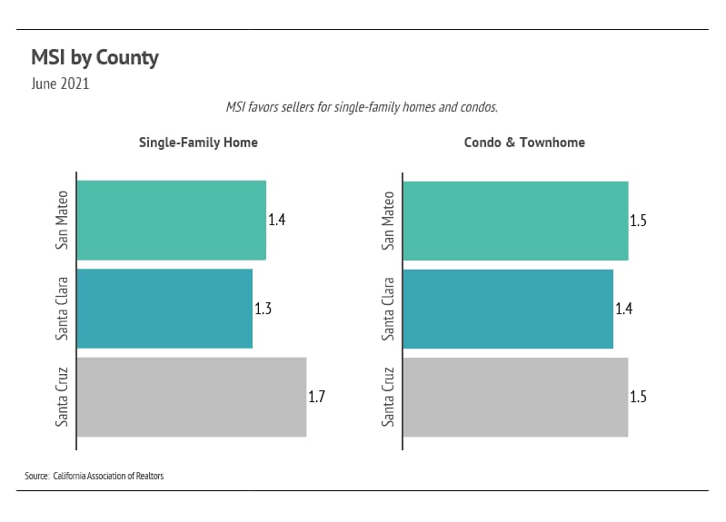 We can use MSI as a metric to judge whether the market favors buyers or sellers. The average MSI is three months in California, which indicates a balanced market. An MSI lower than three means that there are more buyers than sellers on the market (meaning it’s a sellers’ market), while a higher MSI means there are more sellers than buyers (meaning it’s a buyers’ market). In June 2021, the MSI fell below one month of supply for single-family homes and condos, indicating that the market strongly favors sellers.