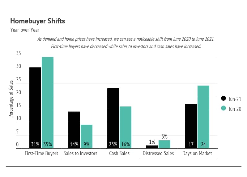 Demand for homes hasn’t diminished as prices soared over the last year. In a typical year, we would expect that a 20% increase in home value would price many potential homebuyers out of the market, thereby causing a price correction. In this instance, we’ve found that to be half true. First-time homebuyers are usually the first to get priced out of the market. Over the past year, we are seeing fewer first-time buyers coming into the market. However, even though there may be fewer buyers in one category, there are plenty of buyers in other categories to make up for them. In this case, we are seeing more investors coming into the market. Cash sales have jumped considerably, and homes are selling extremely quickly. As a result, it looks like prices will climb higher in the near future.