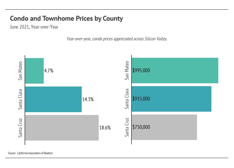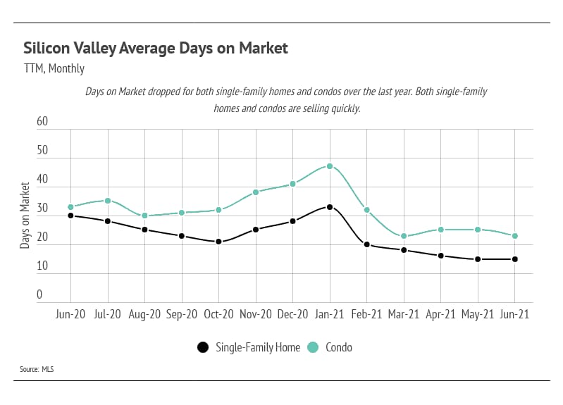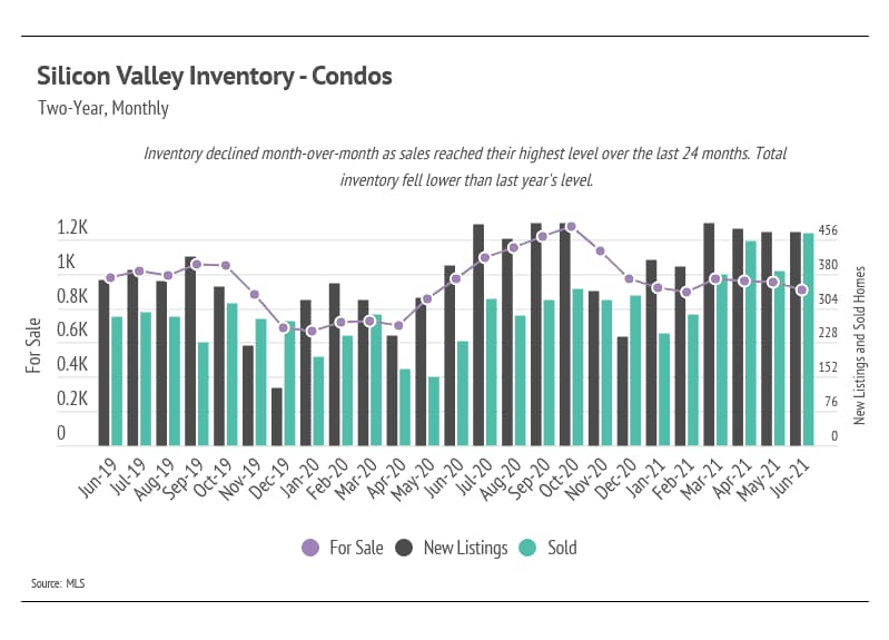 The number of condos on the market declined in June 2021, dropping inventory lower than last year’s levels. Although we’ve seen more condos than usual come to market over the last three months, condo sales reached their highest level over the last 24 months in Silicon Valley in June.