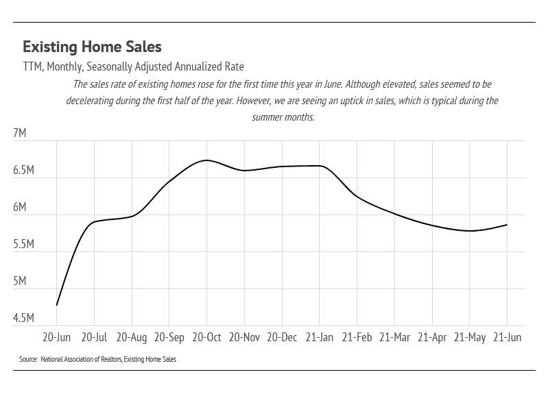 As we look at the last 12 months of annualized home sales in the chart below, we can see that sales rose significantly since last June. Although the rate of sales decelerated from January to May 2021, it rose again in June, which is a seasonal norm. More homes are coming to market and being bought quickly due to the excess demand. In 2020, incentives to purchase a home translated to the most homes sold in a year since 2006. Although we’re only halfway through 2021, it’s safe to say that home sales will outpace those in 2020.