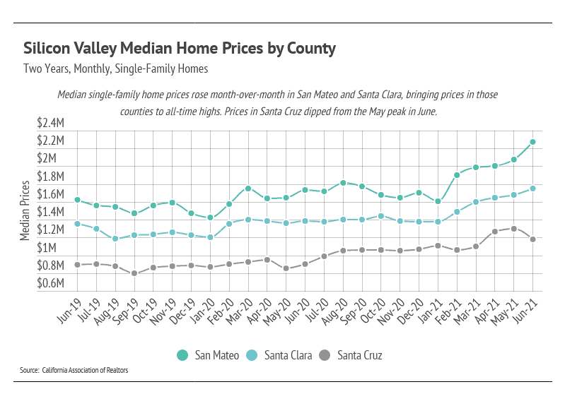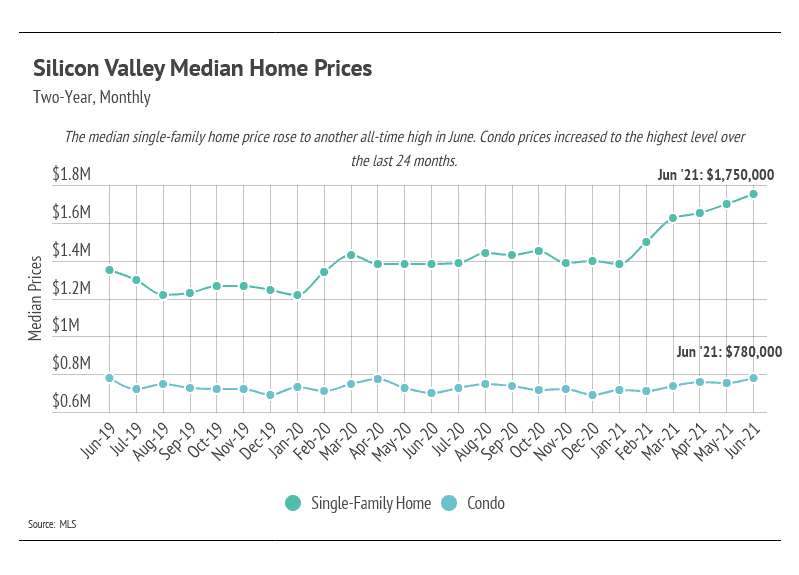During June 2021, in Silicon Valley, the median single-family home price rose to a new all-time high. Condo prices rose month-over-month to the highest level in the last 24 months. By county, San Mateo and Santa Clara both rose month-over-month, while Santa Cruz prices fell from the May peak.