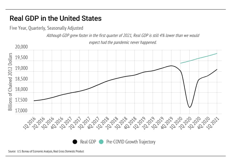 The chart below illustrates the cost of a recession. While it depicts U.S. GDP from 2016 to 1Q 2021, it also illustrates economic patterns that occur in all recessions. GDP tends to grow at a fairly consistent rate during economic expansions. The green line illustrates the expected GDP had the pandemic never happened. As that green line shows, we are 30% below where GDP was expected to be in 1Q 2021. In other words, we’re still underwater despite the impressive quarterly increases in GDP.