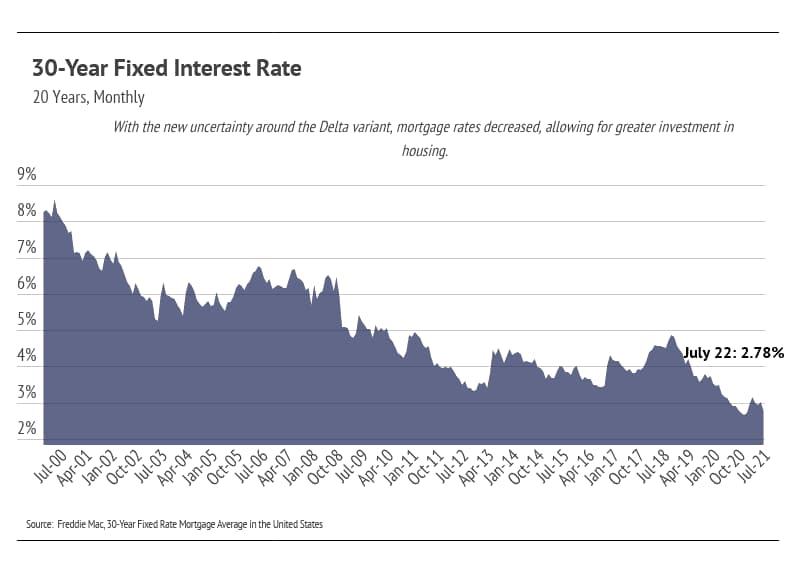 The fresh uncertainty surrounding the Delta variant caused rates to drop. The Federal Reserve is expected to support the financial markets by infusing money into them, which lowers rates and, in this instance, causes inflation to rise. As shown in the chart below, we are currently hovering at historically low mortgage rates, which will likely remain for the rest of the year. Low rates and inflation both incentivize buying. When consumers know that the dollar’s purchasing power is diminishing quickly, it makes more sense for them to buy a home sooner rather than later.