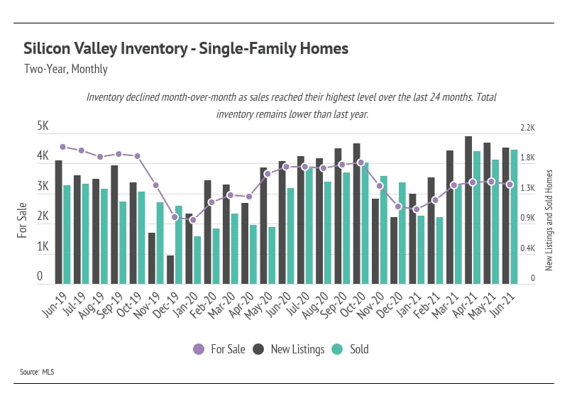 Single-family home inventory began to climb at the start of 2021 in anticipation of the spring season, when more sellers typically come to market, but has begun to decline once again. To gain a full picture of the current market, we must view it in the context of last year. In 2020, fewer people wanted to leave Silicon Valley, while more people wanted to move to the area. This trend drove inventory down to record low levels. New listings, therefore, improve the current market conditions. However, new listings aren’t keeping up with demand. In June 2021, Silicon Valley had 15% fewer homes for sale than it did in June 2020. Furthermore, when we compare the current inventory to June 2019 (pre-pandemic) levels, the number of homes for sale has declined by 27%. The sustained low inventory will likely cause prices to appreciate throughout 2021.