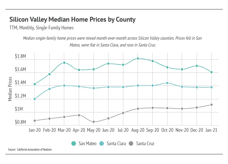 Median single-family home prices were mixed across Silicon Valley counties. Prices have remained quite stable over the last 12 months.