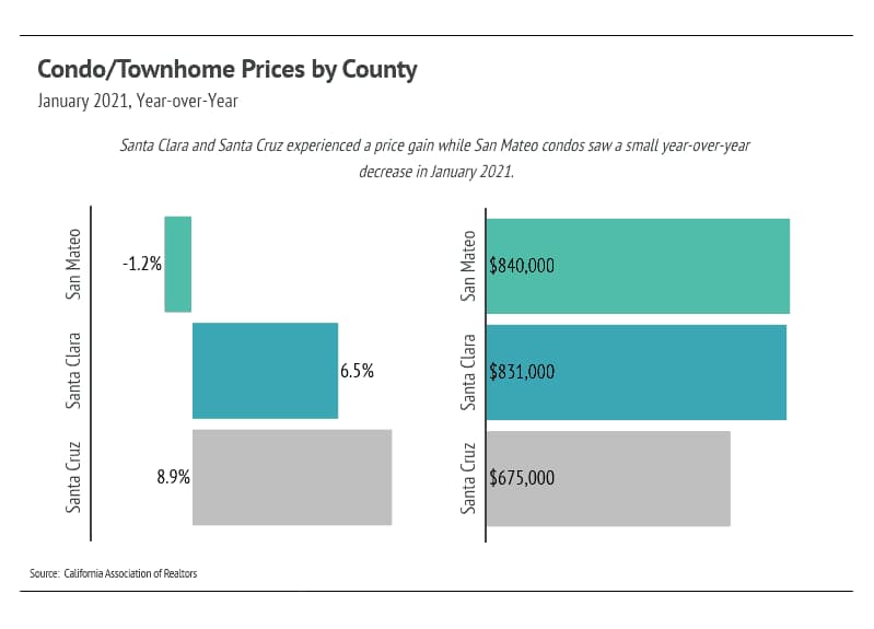 As you can see in the graph on the next page, median condo prices were mixed across counties. San Mateo condo prices are slightly lower than last year, while Santa Clara and Santa Cruz condo prices rose.
