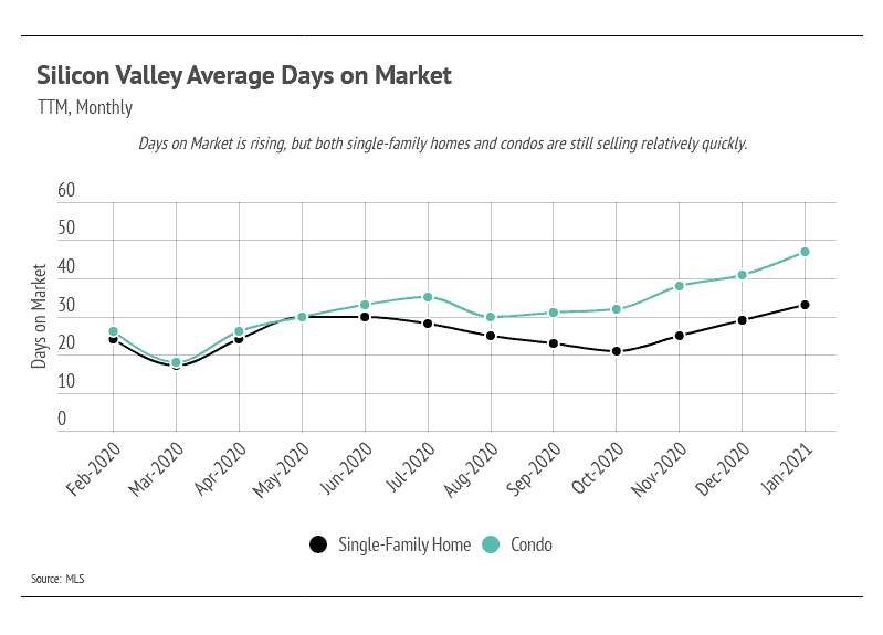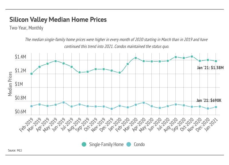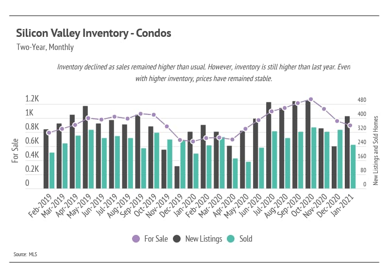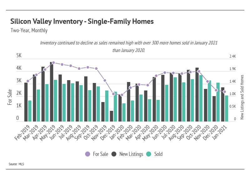 We anticipate new listings to slow until around March 2021. While the winter season tends to see a slowdown in activity, January 2021 showed higher-than-normal sales, once again highlighting the desirability of Silicon Valley.