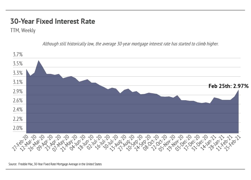 Key Topics and Trends in March: The low supply of housing appears even smaller when considering only 27% of the population can afford to purchase a home. Mortgage rates are likely to remain historically low through 2021 but have begun to rise, which will affect housing affordability.