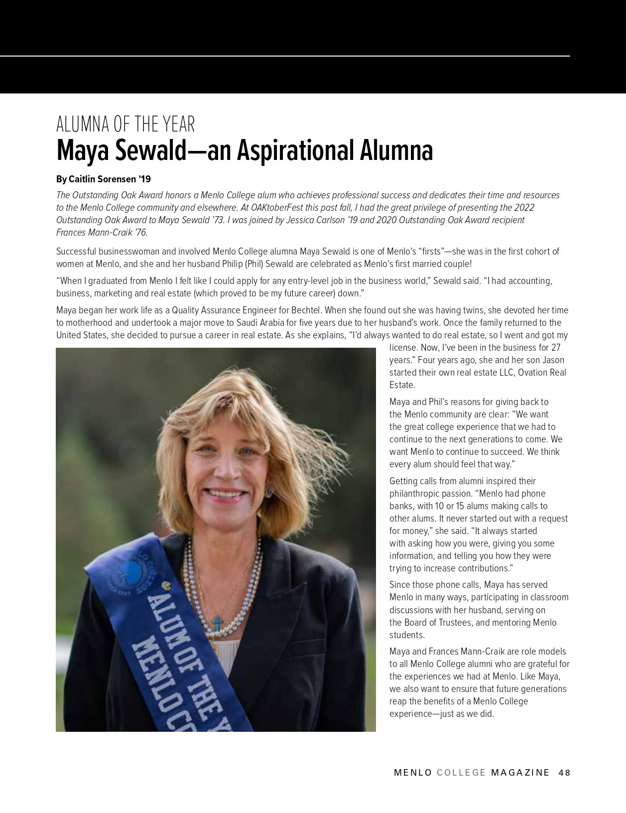 I was honored and humbled to be featured in the Menlo College Magazine, Winter 2023. Along with my husband Phil, our shared value is that education is key towards personal fulfillment and success. This also aligns perfectly with the mission of the Menlo Rotary Community Foundation, of which I am President-elect, whose main focus is providing college scholarships to deserving underserved youth who are the first in their family to attend college.