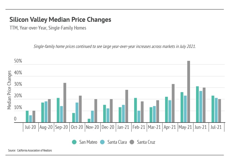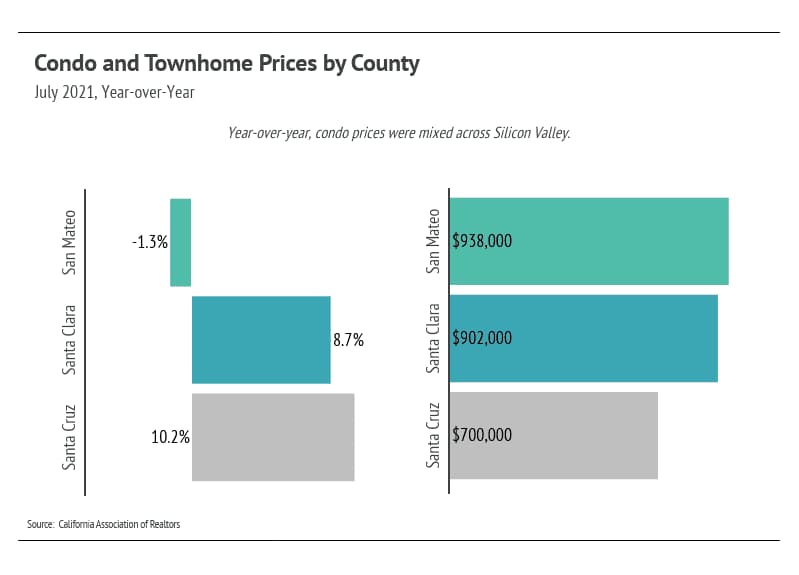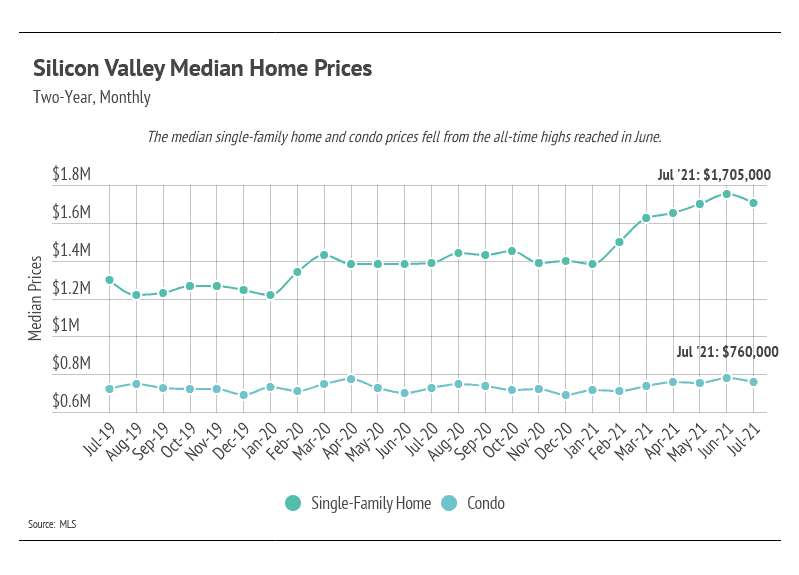 During July 2021, in Silicon Valley, median single-family home and condo prices fell from the highs reached in June. By county, single-family home prices in San Mateo and Santa Clara both declined month-over-month, while Santa Cruz prices remained the same.