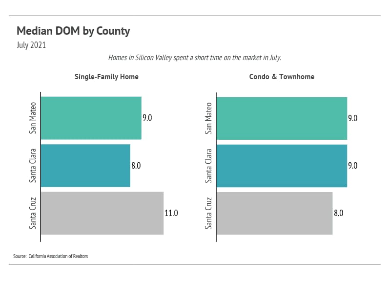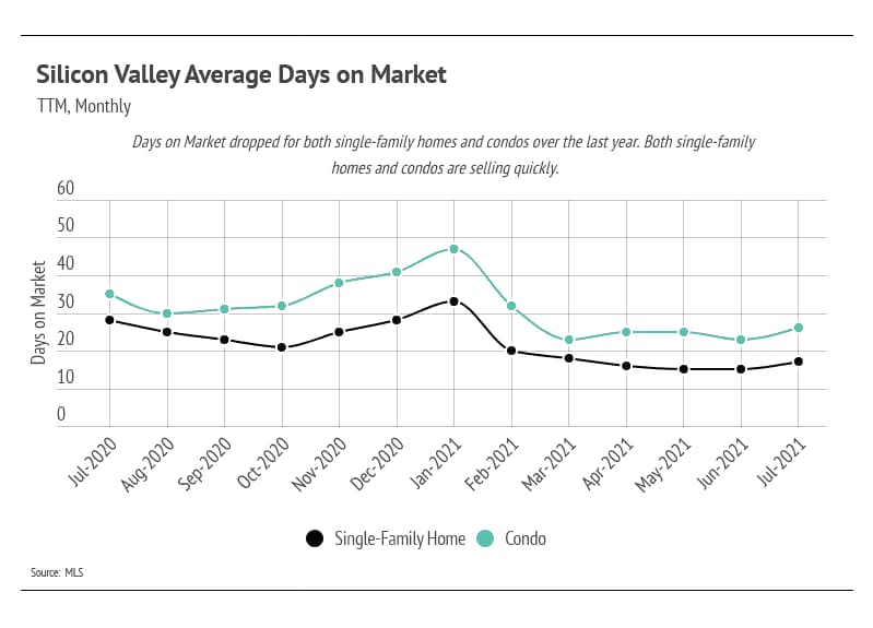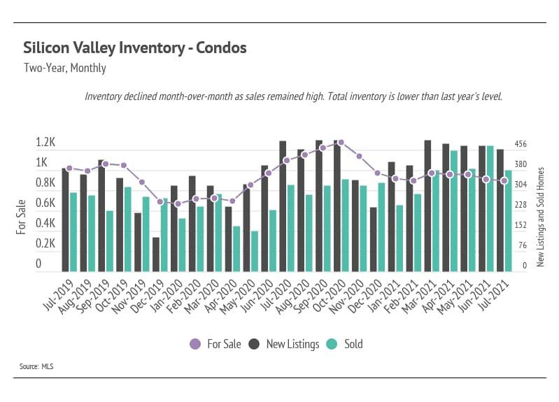 The number of condos on the market declined in July 2021, keeping inventory lower than last year’s levels. Although we’ve seen more condos than usual come to market over the last five months, condo sales have kept pace. Condo demand remains incredibly high in Silicon Valley, and new listings are selling quickly.